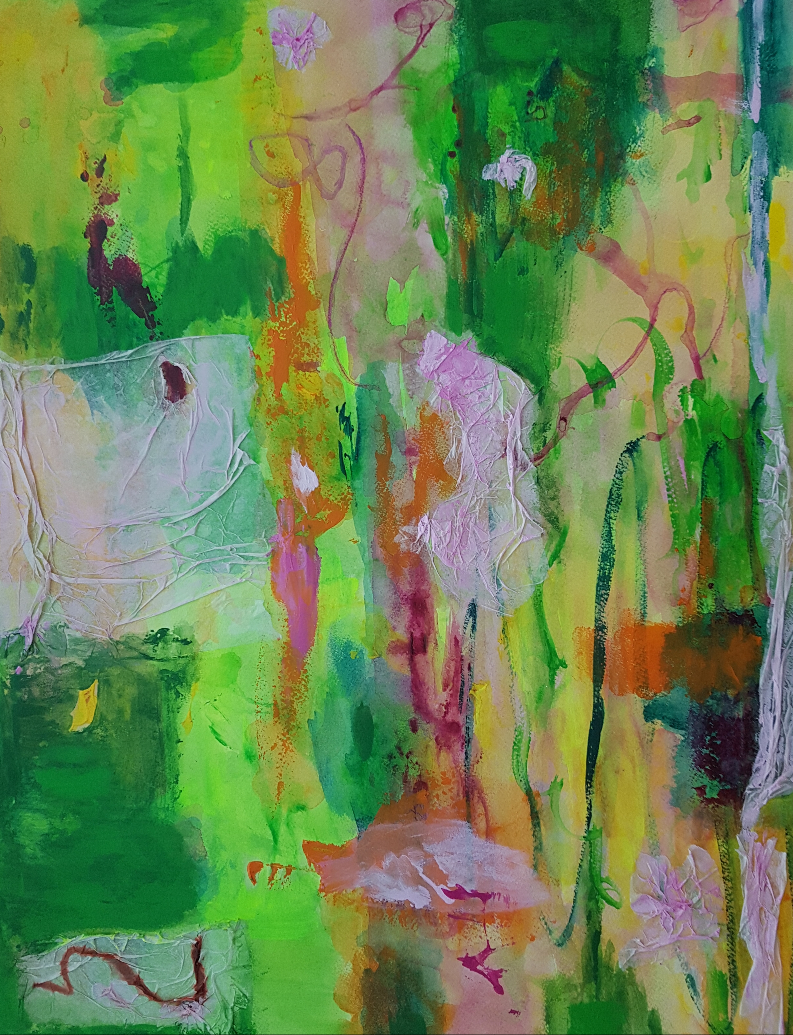 Farbkompositionen entstehen intuitiv und frei ohne Vorlage in Farbschichten, hervorgerufen mit einer speziellen Maltechnik. Beim Betrachten entdecke ich dann neue Formen, die betont oder übermalt und transformiert werden. Dazu brauche ich Mut, um so eine neue Dimension zu erreichen.