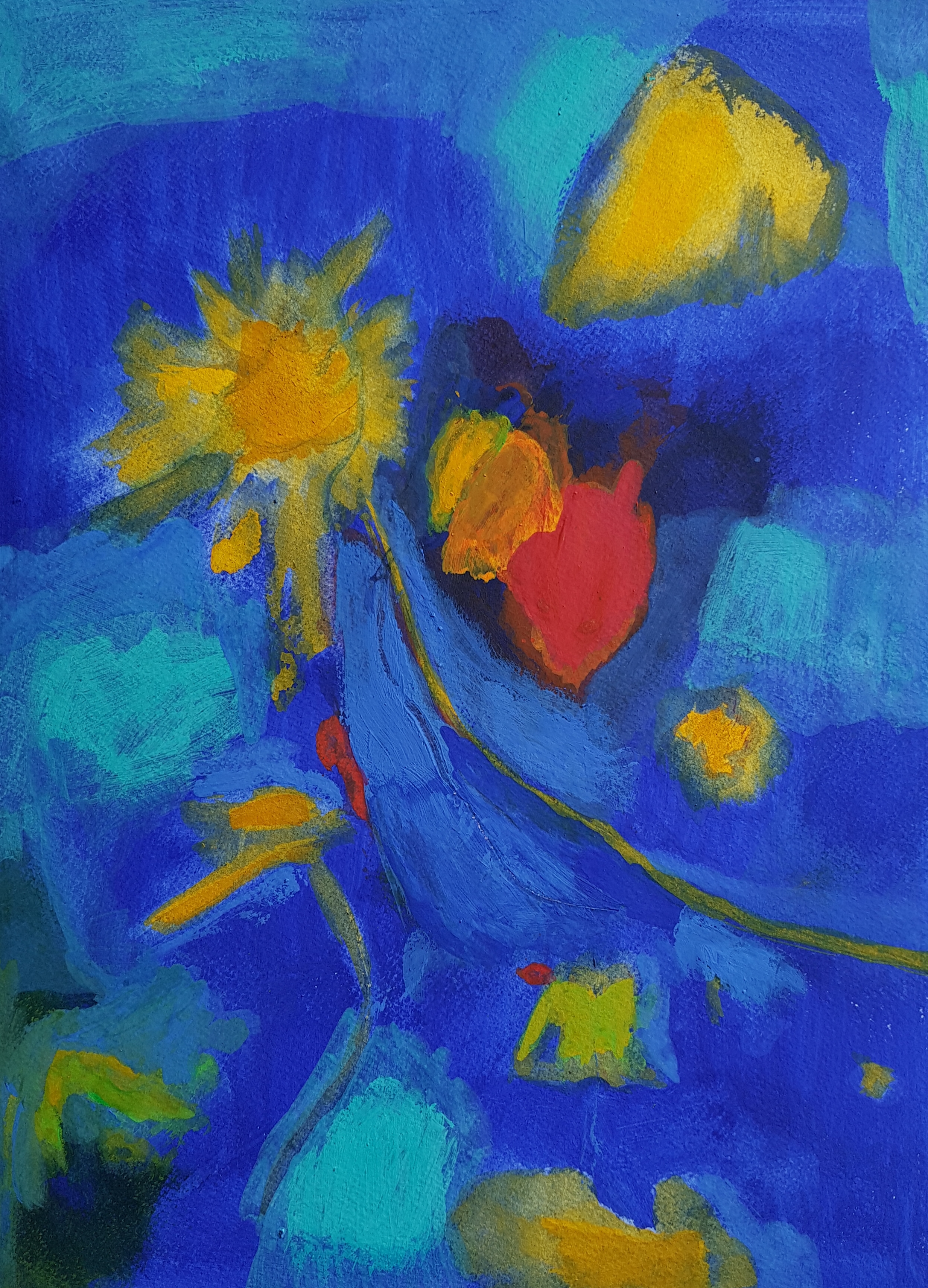 Eine leere Leinwand vor mir, völlig losgelöst vom Alltag mit einem inneren Lächeln und Liebe im Herzen, fange ich an zu malen.